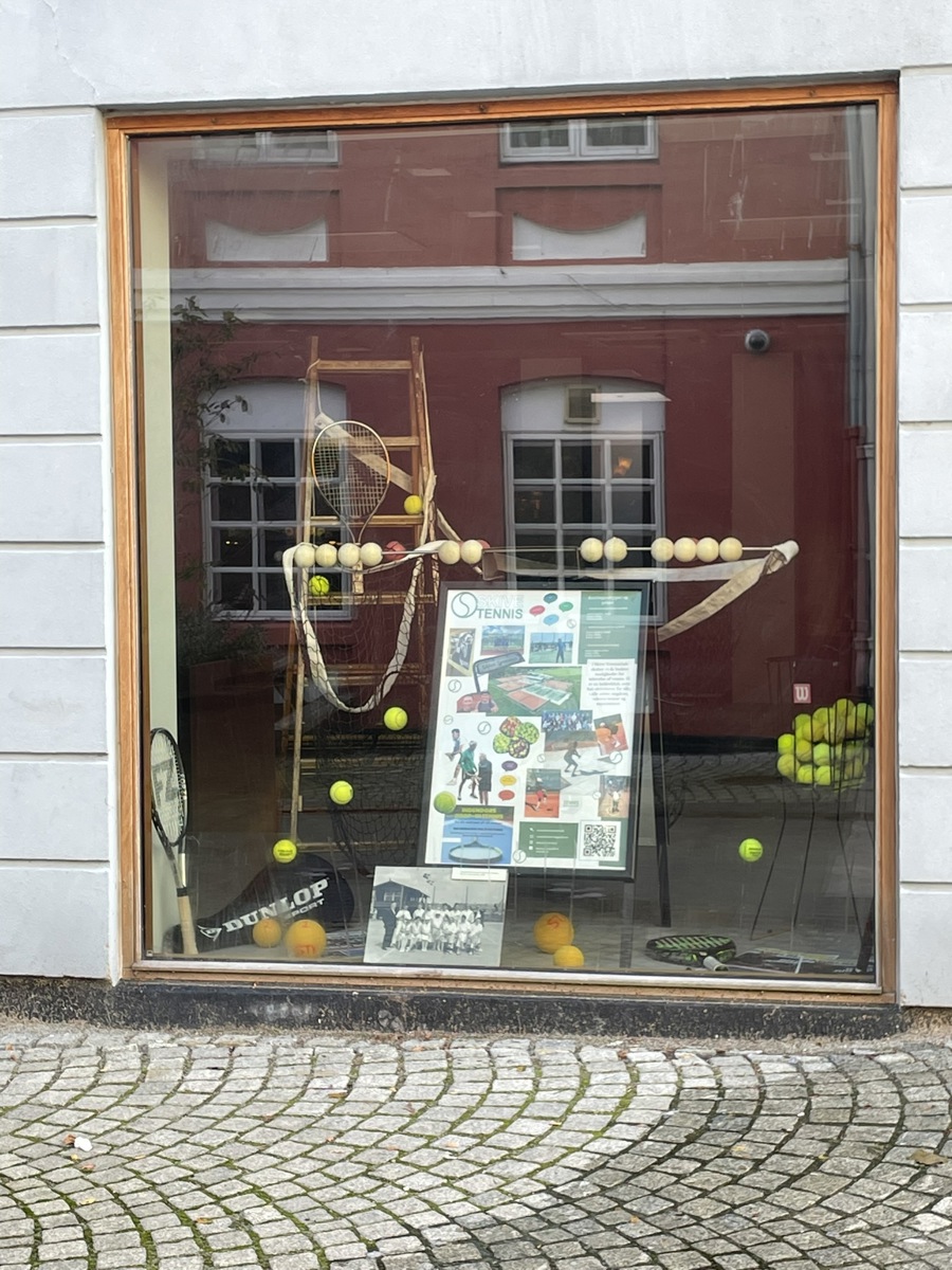 En lille arbejdsgruppe har I al hast lavet en udstilling for tennis og padel i et butiksvidue I Adelgade. I har sikkert bemærket, at der igennem snart nogle år dukker inspirerende INFO- og PR- udstillinger for foreningslivet I Skive rundt om I de ledige butiksvinduer. Arne Wang har en finger med I spillet, og pludselig opstod muligheden for vores klub. Der vil givetvis være mange, der lige stopper op, og måske lader de sig inspirere. Tak for indsatsen til den lille hårdt og hurtigt arbejdenden gruppe.